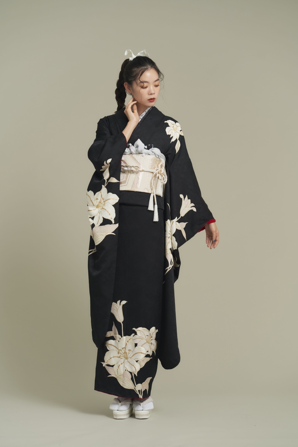 黒色はもっとも収縮効果が高く、引き締まった印象を与えてスタイルアップを叶えてくれます。地色が無彩色のため、柄や帯の色を際立たせやすく、組み合わせ次第で印象を自在に変えられるのも特徴です。たとえば、ピンクの柄を合わせれば可憐に、ブルーならクールに、ゴールドなら豪華にと、幅広い表情を演出できます。