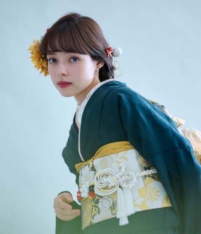 寒色系の濃い緑色は引き締め効果があり、黒ほどクールになりすぎず、大人っぽさと華やかさを兼ね備えています。自然を思わせる緑色は心を穏やかにし、爽やかで落ち着いた印象を与えてくれるため、成人式などの節目にふさわしい選択と言えるでしょう。