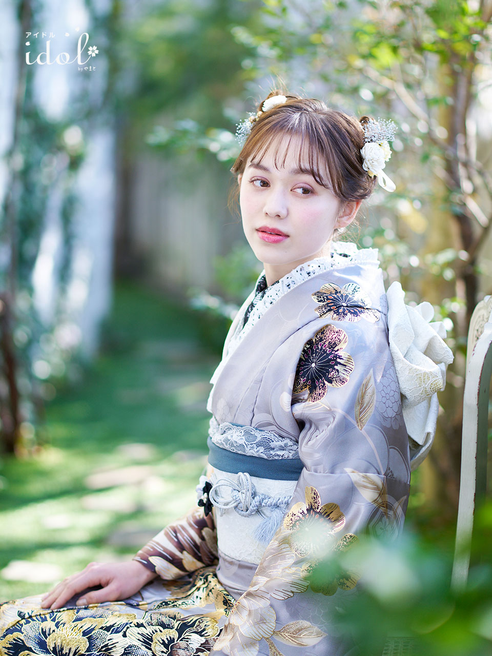 くすんだグレーが現代的な振袖。裾に施された大花が大胆であり、品のある一枚。