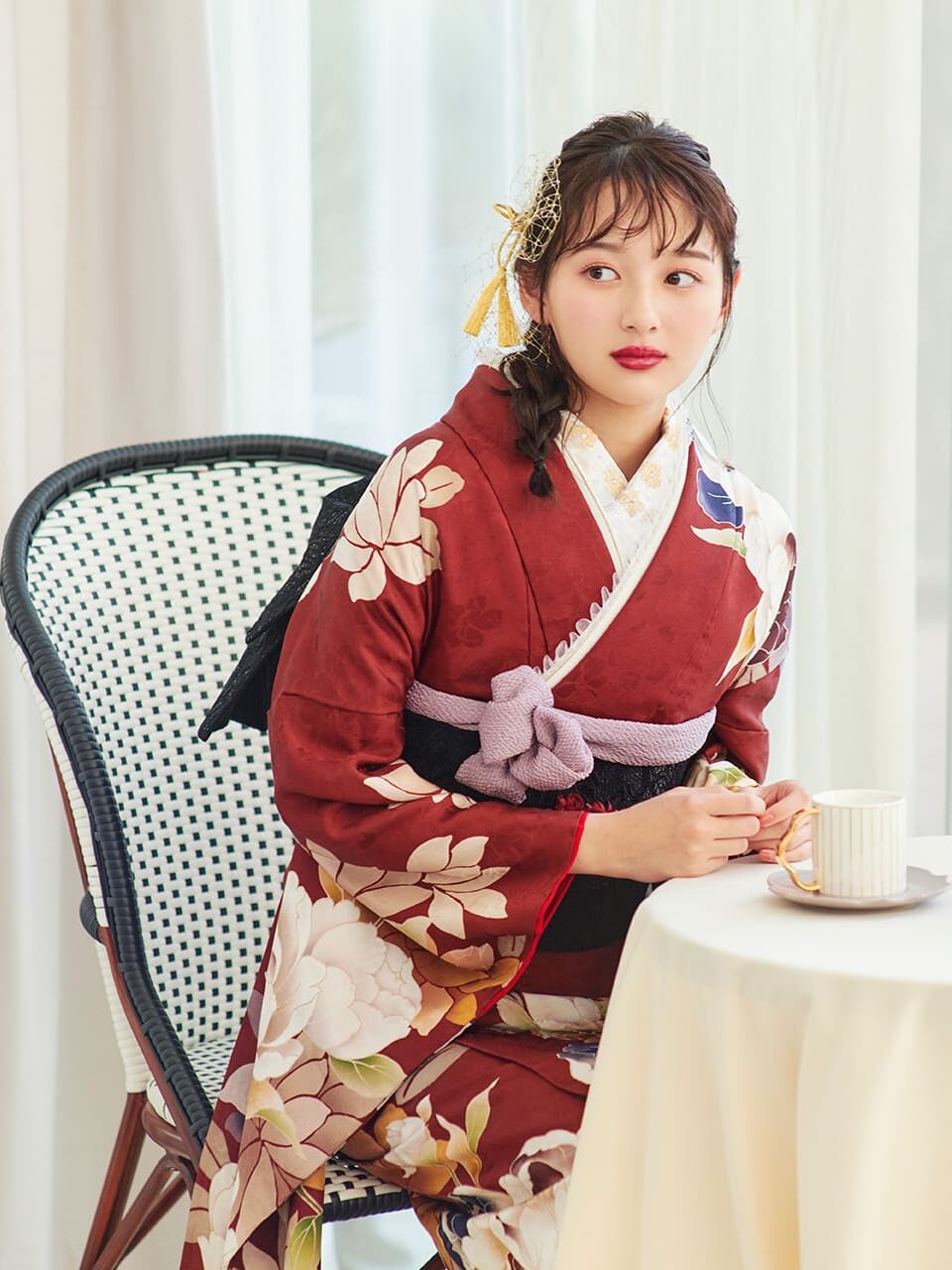 バーガンディーが珍しい、おしゃれな赤系振袖。モダンな花々が、落ち着いた中にも可愛らしさを演出している一枚。
