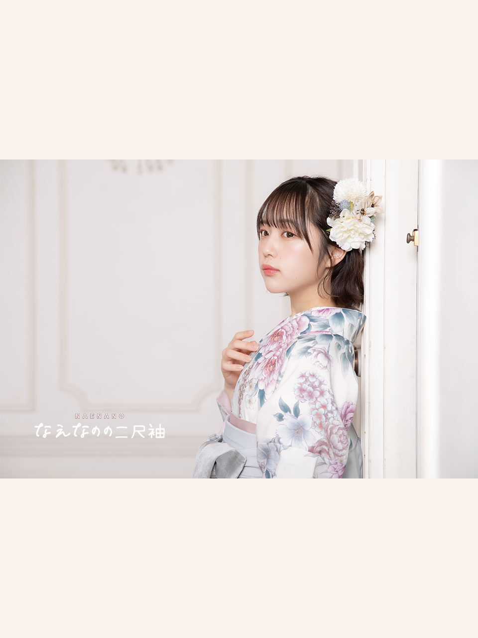 清楚で品のある白地に、淡い色味の洋花がかわいらしく、ペールトーンで統一感のあるコーディネート。袴のサイズ:S.M.L.2L。
