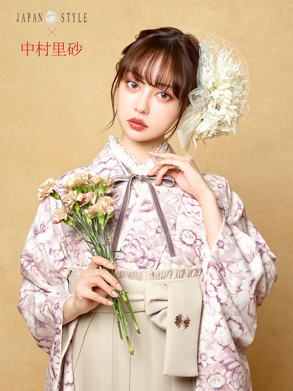 【入荷予定】洋花の総柄が可憐で華やかな雰囲気。トレンドであるくすみカラーの袴がポイント。ご予約受付締切:2023年12月頃。袴のサイズ:S.M.L.2L.3L。