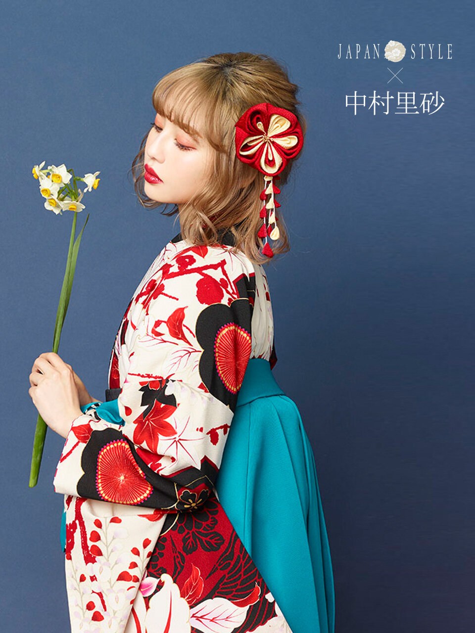 白地に赤が映える個性的なきものは、あさぎ色とあわせて上級コーディネート。