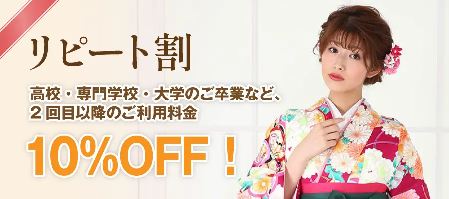 アイドルで袴レンタルを2回目からのご利用で10%OFFにてご利用いただけます。